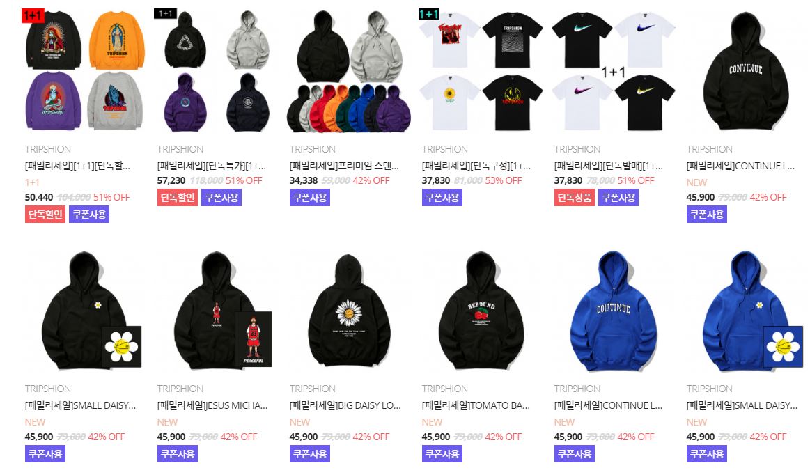 할인 품목 : 맨투맨, 후드티 등