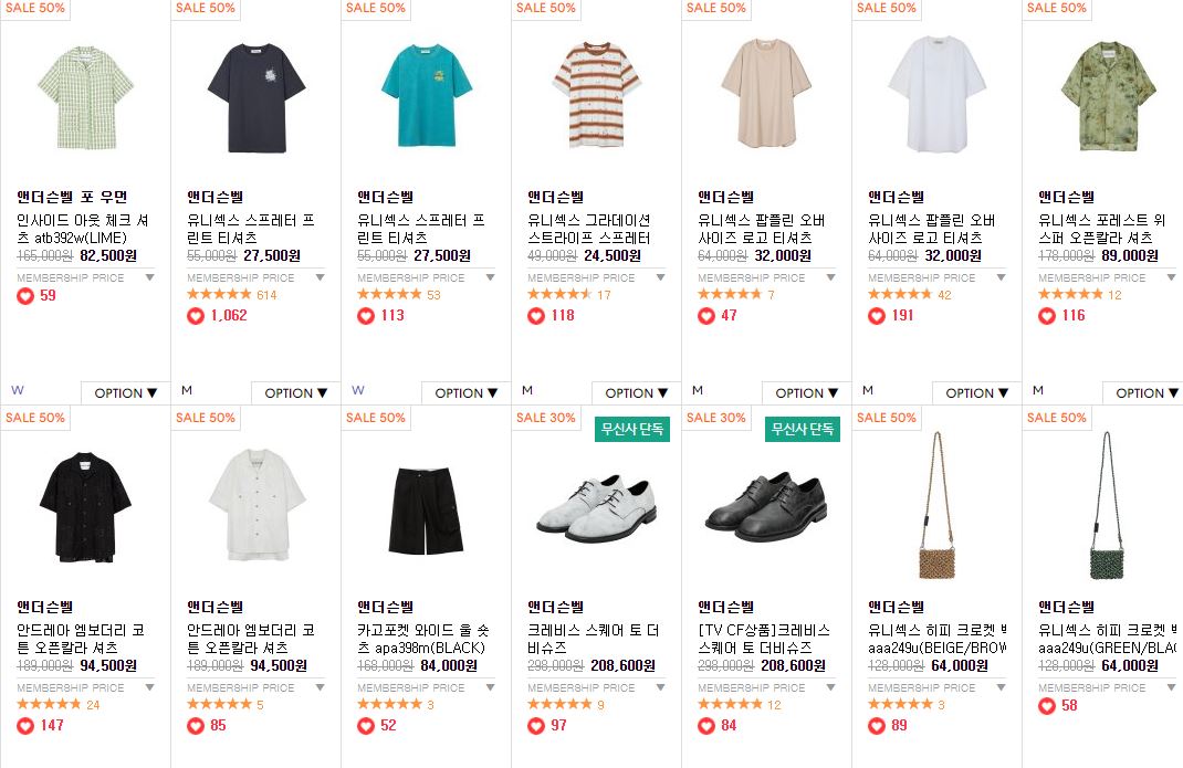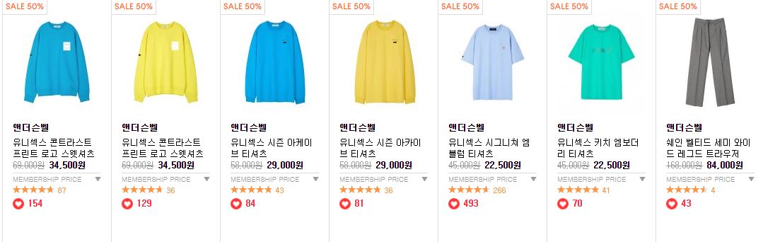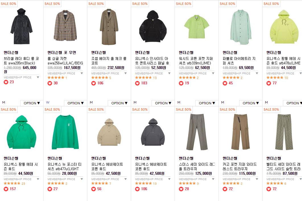 할인 품목 : 코트, 티셔츠, 팬츠 등
