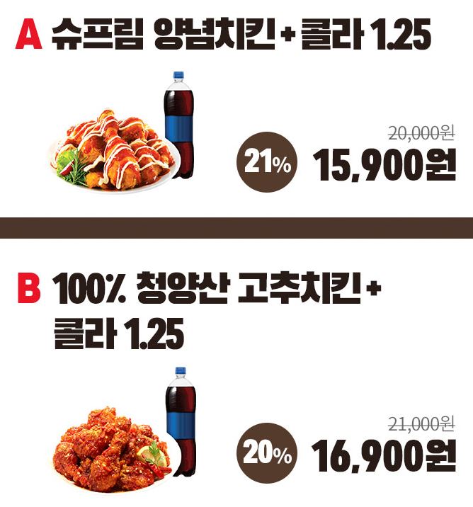 할인 메뉴 : 슈프림양념치킨, 100% 청양산 고추치킨