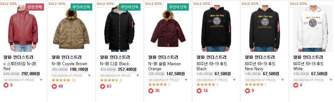 알파 인더스트리 다양한 제품을 할인 판매하네요.