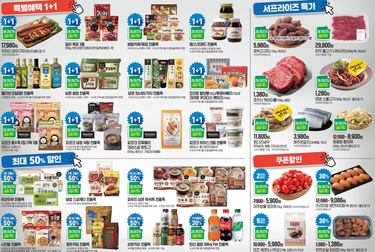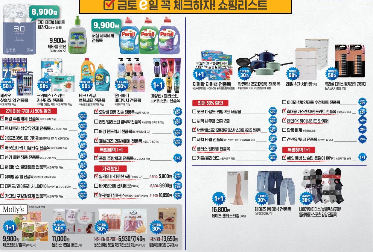 할인 품목 : 냉동식품, 생필품, 육류, 과일 등