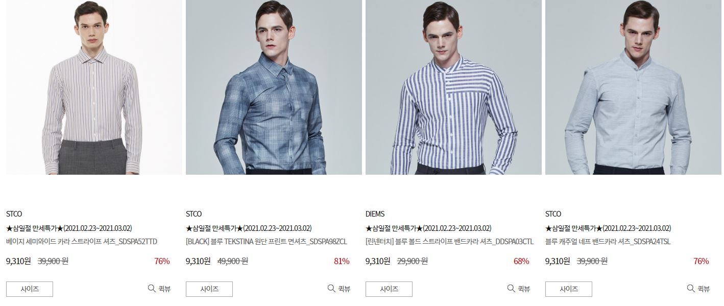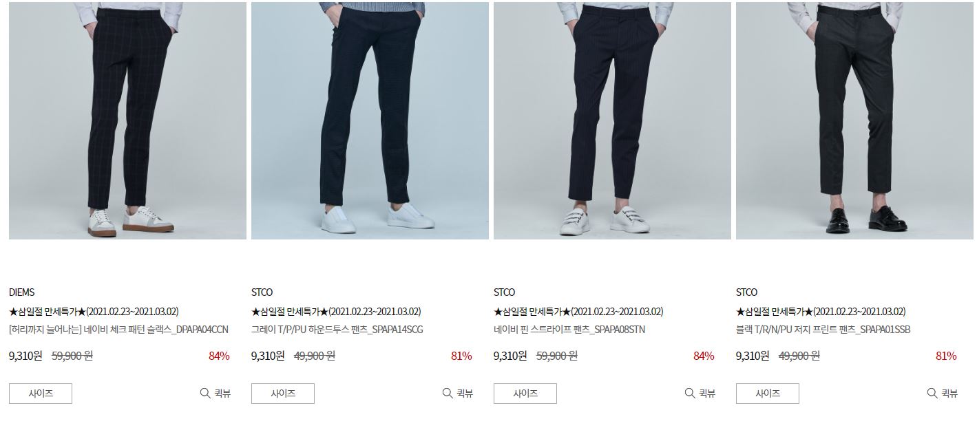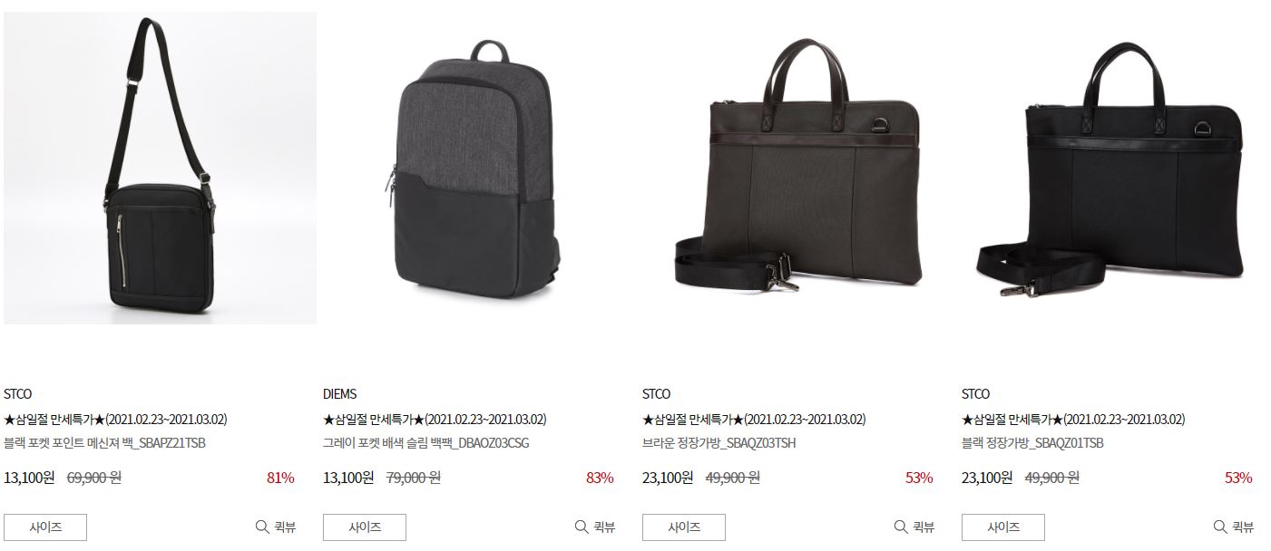 할인 품목 : 셔츠, 팬츠, 티셔츠, 가방 등