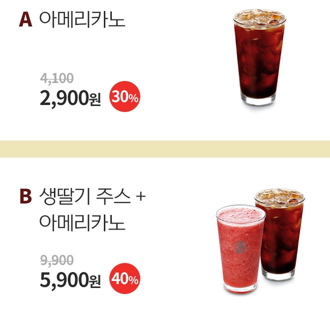 할인 메뉴 : 아메리카노, 생딸기주스 등