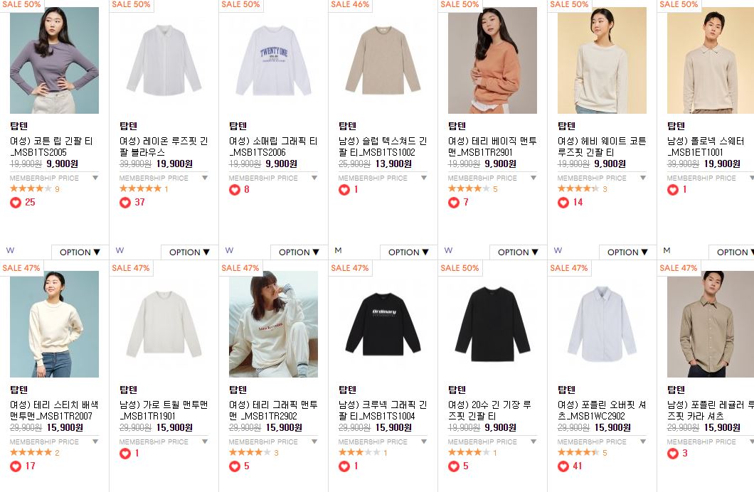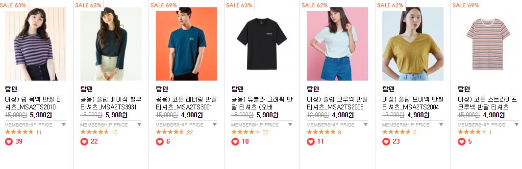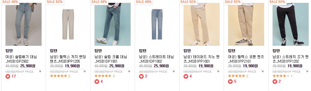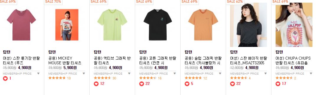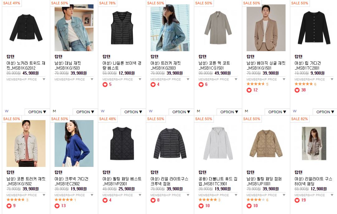 할인 품목 : 티셔츠, 자켓, 팬츠 등