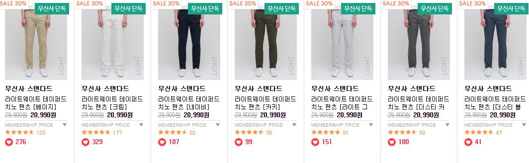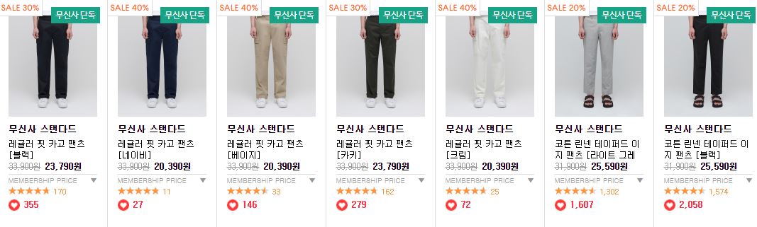 할인 품목 : 카고 팬츠, 치노팬츠 등