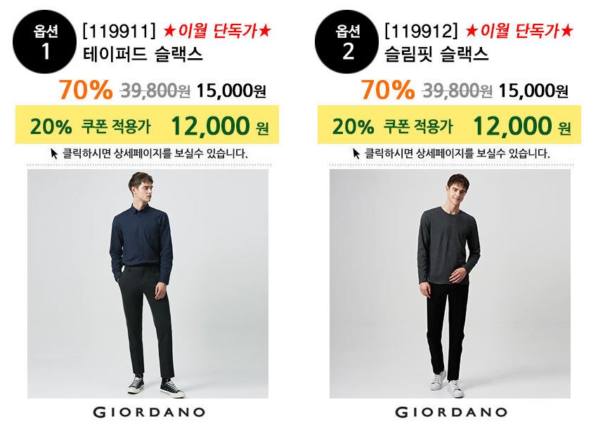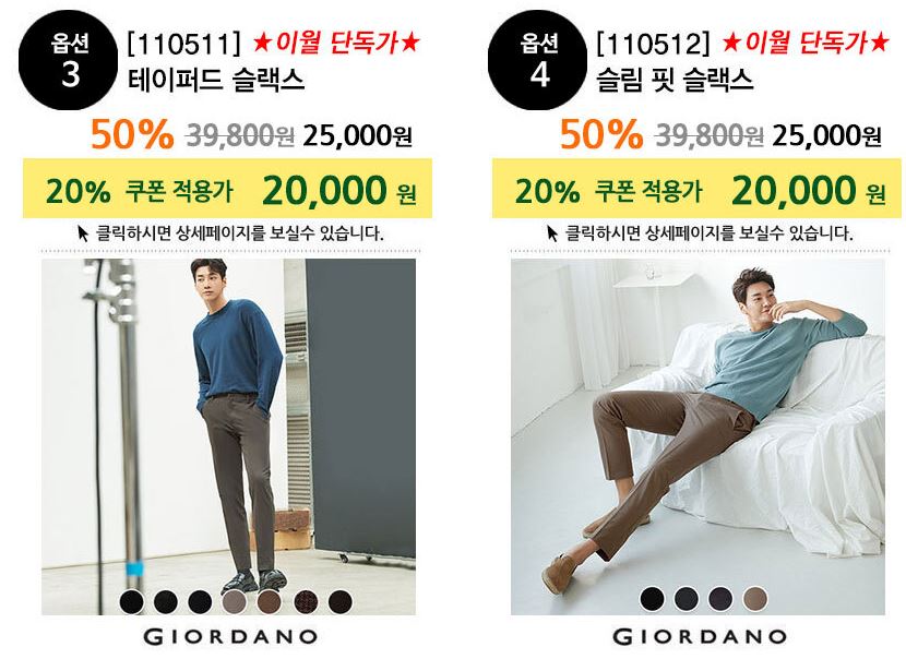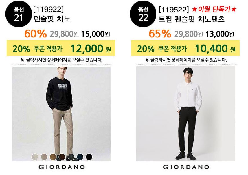 할인 품목 : 슬랙스, 치노팬츠, 티셔츠 등