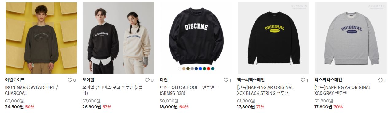 할인 품목 : 맨투맨, 후드티, 팬츠 등