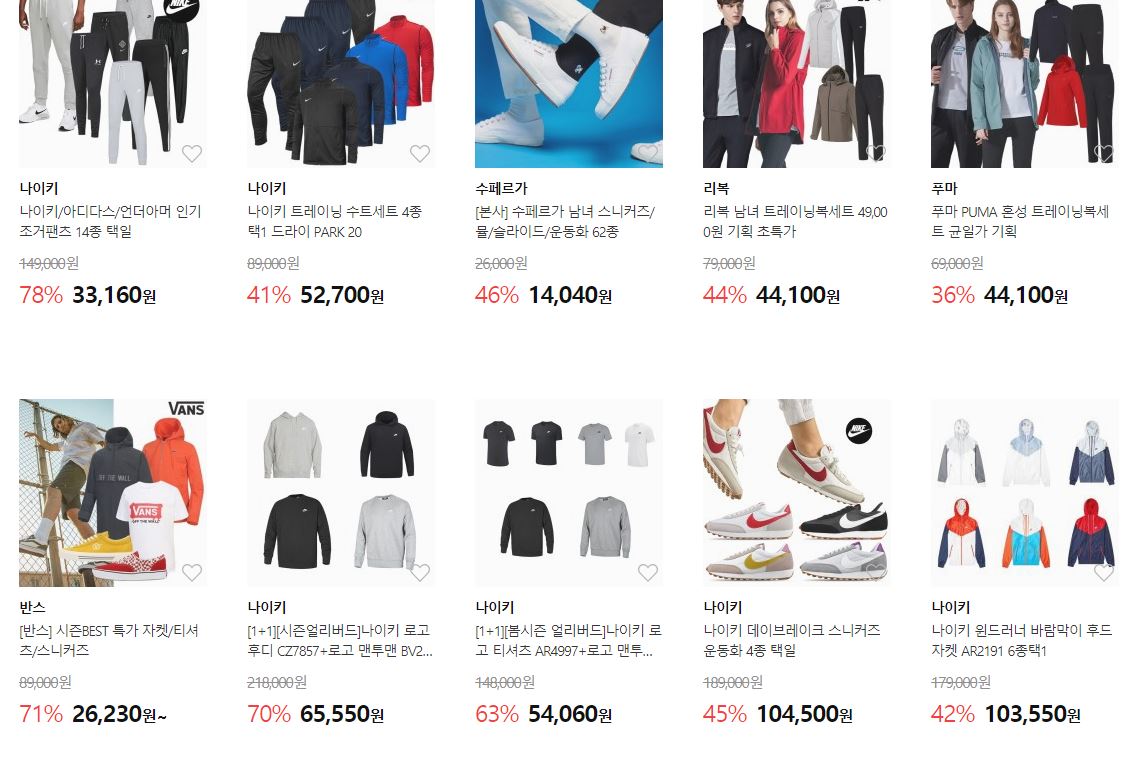 할인 품목 : 티셔츠, 운동화, 자켓 등