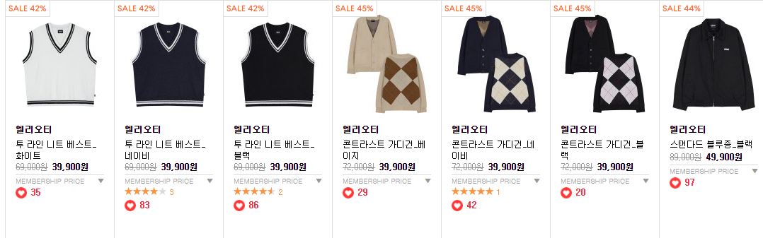 할인 품목 : 맨투맨, 후드티, 가디건 등