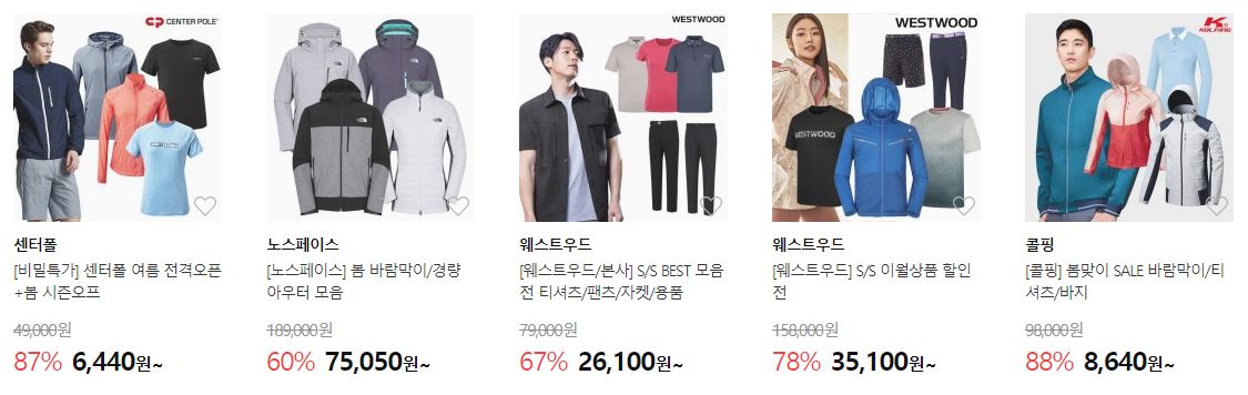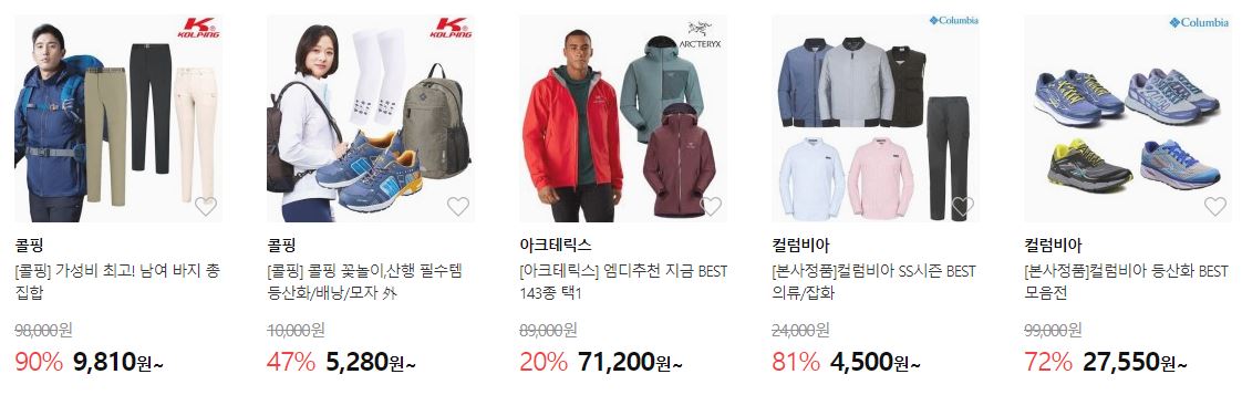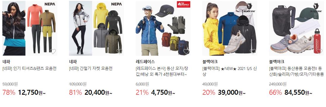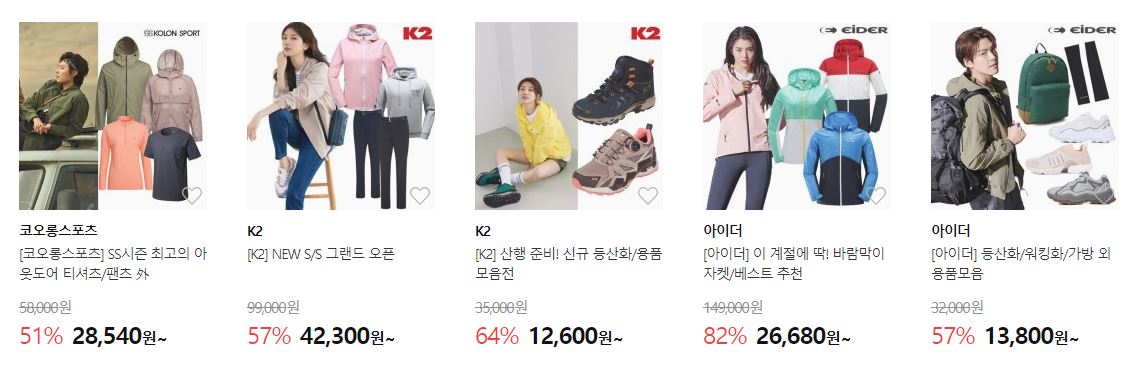 할인 품목 : 자켓, 티셔츠, 팬츠, 등산화, 가방 등