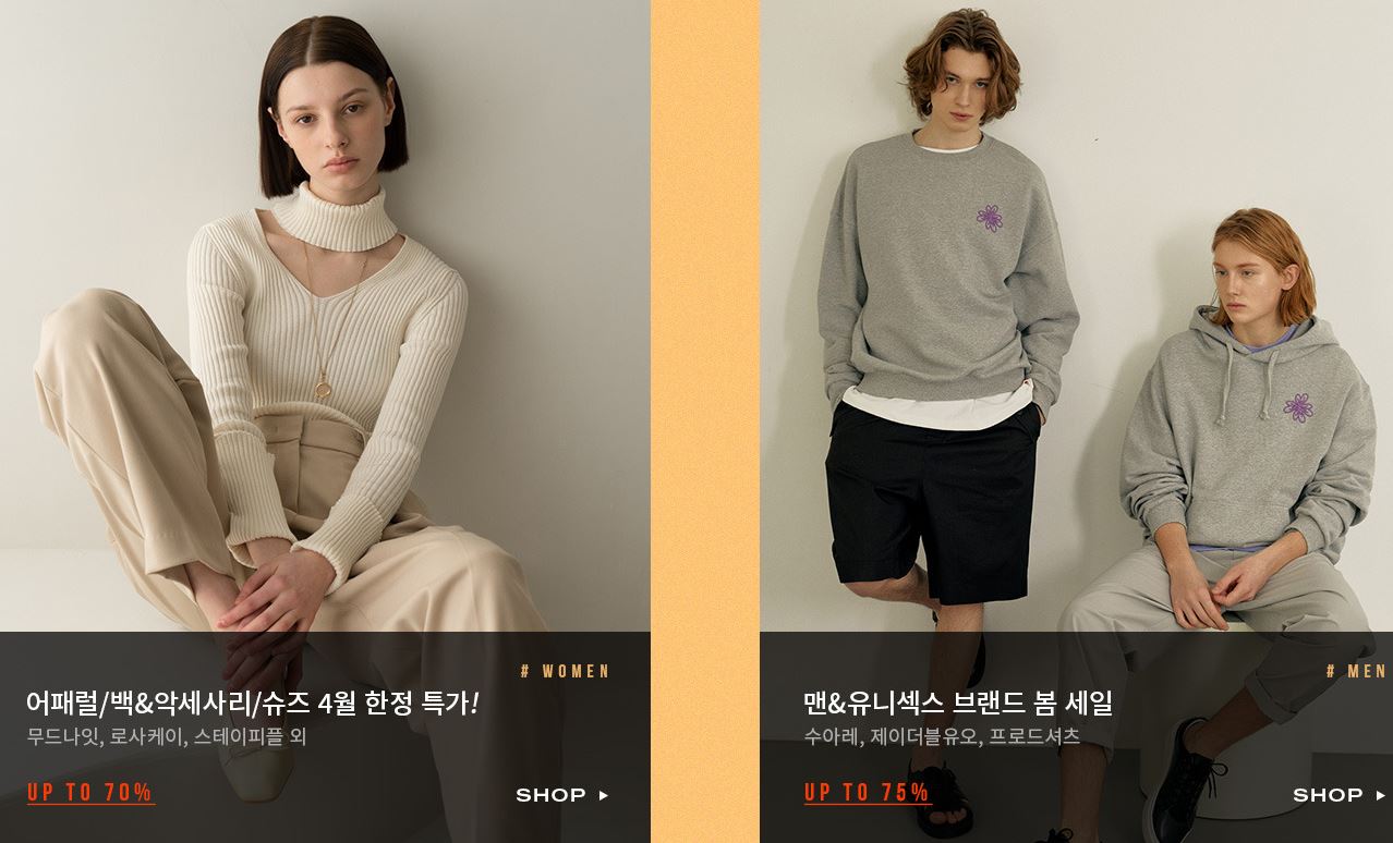 할인 품목 : 의류, 악세사리, 가방, 신발 등
