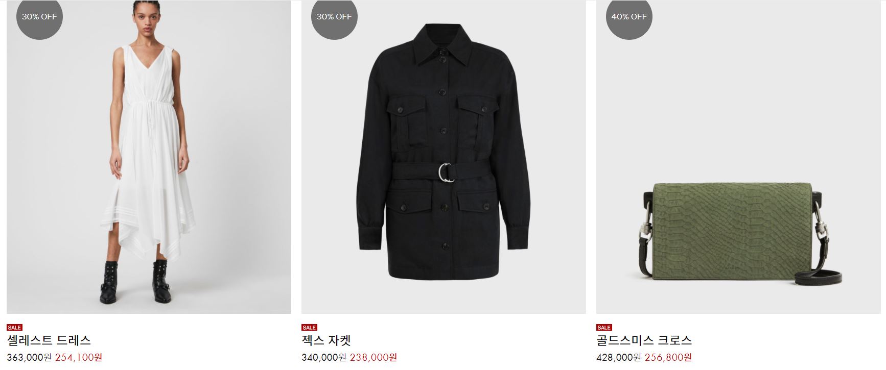 할인 품목 : 티셔츠, 드레스, 가방 등