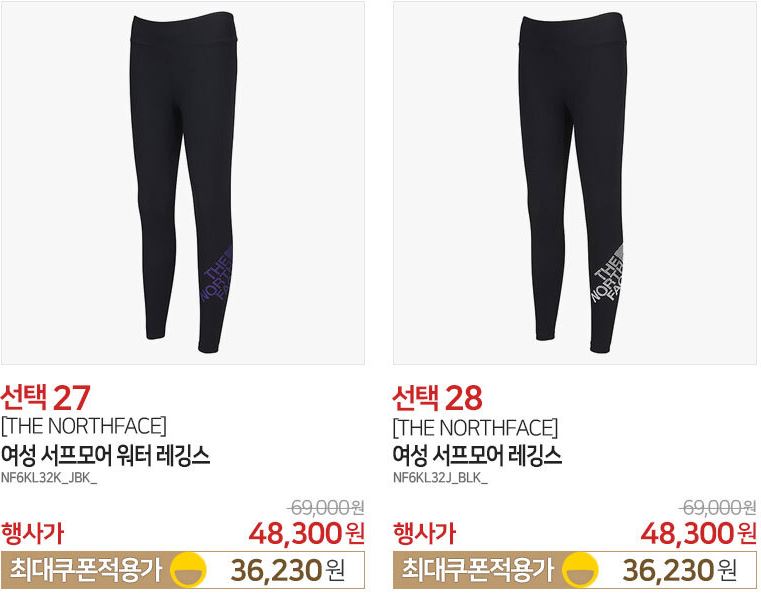 할인 품목 : 티셔츠, 팬츠, 레깅스 등