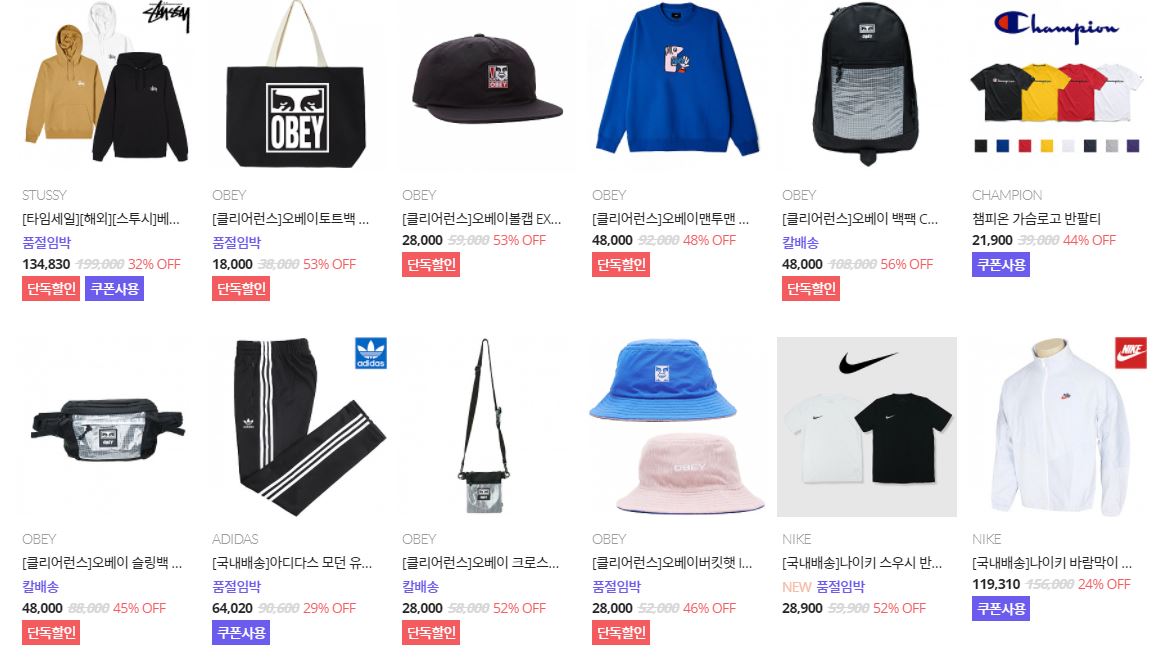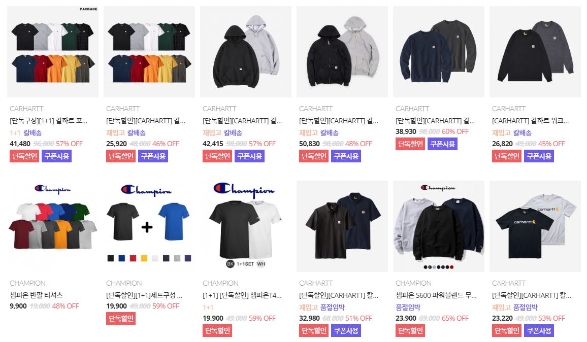 할인 품목 : 후드티, 티셔츠, 모자 등