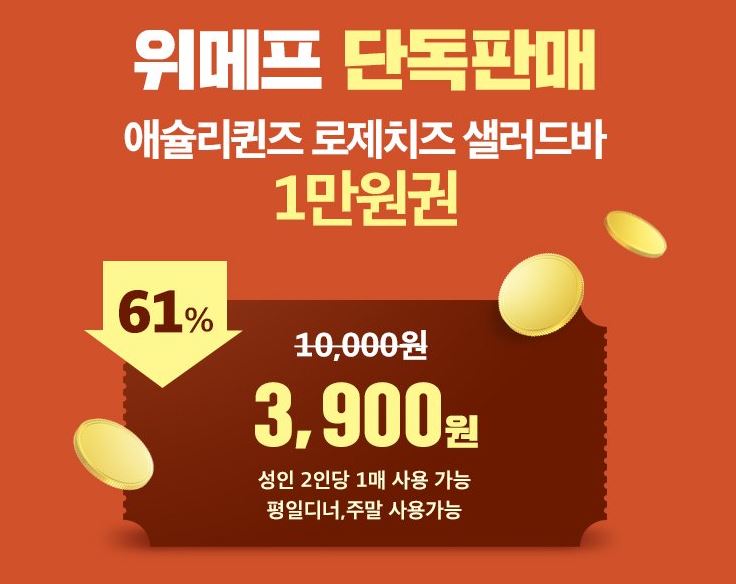 애슐리퀸즈 로제치즈 샐러드바 1만원권 61% 할인 정보 포스팅입니다.