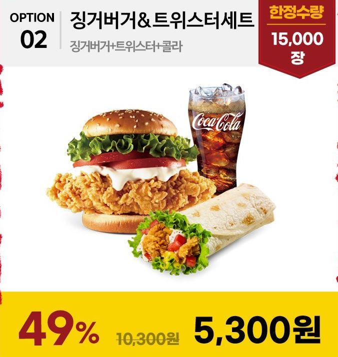 할인 메뉴 : 치킨반값팩, 징거버거&트위스터세트