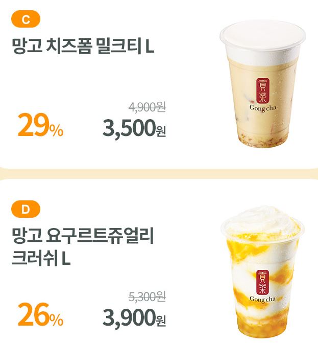 할인 메뉴 : 망고 치즈폼 밀크티, 피스타치오 밀크티 등