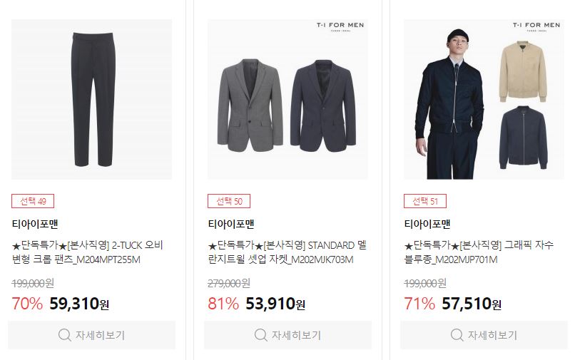 할인 품목 : 자켓, 티셔츠, 팬츠 등