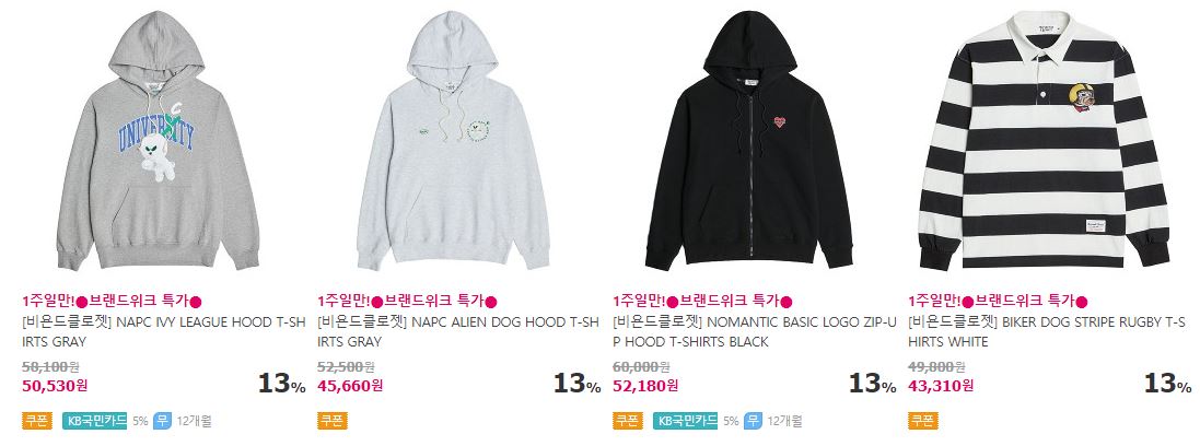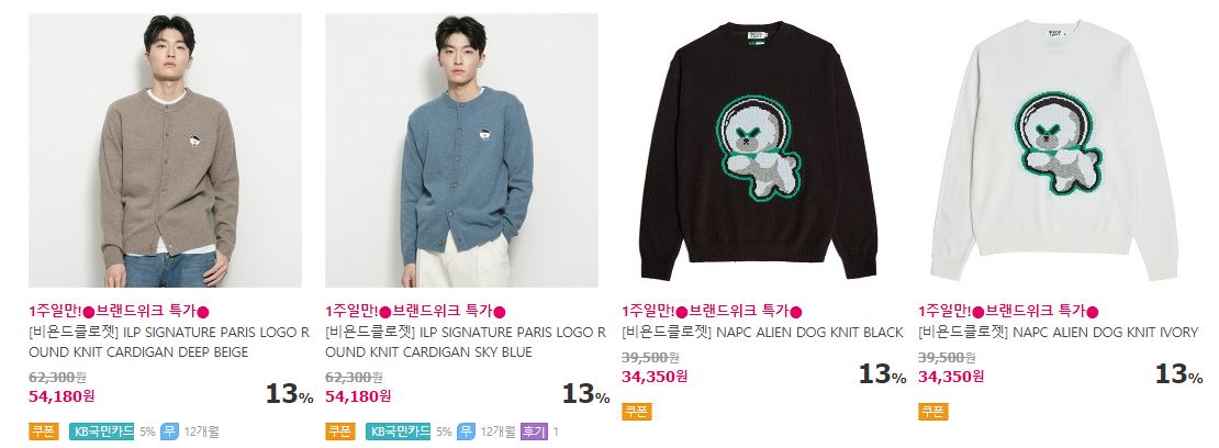 할인 품목 : 티셔츠, 니트, 팬츠 등