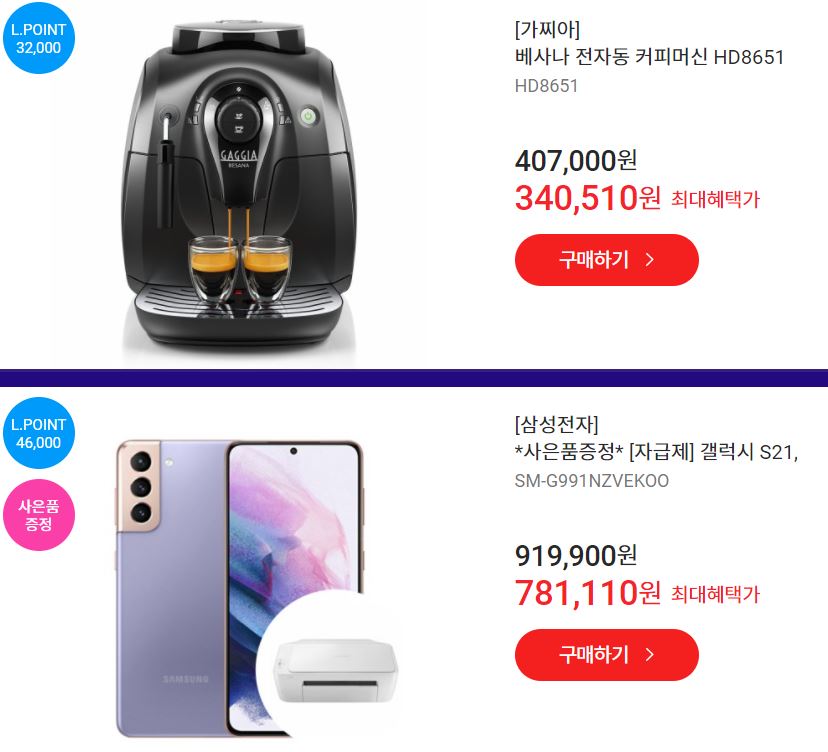 할인 품목 : 에어컨, 휴대폰, 커피머신 등