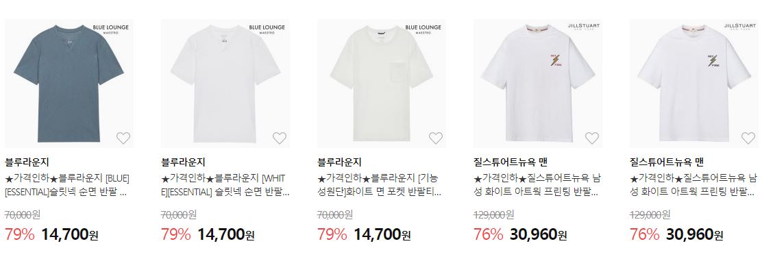 할인 품목 : 티셔츠, 셔츠, 팬츠 등
