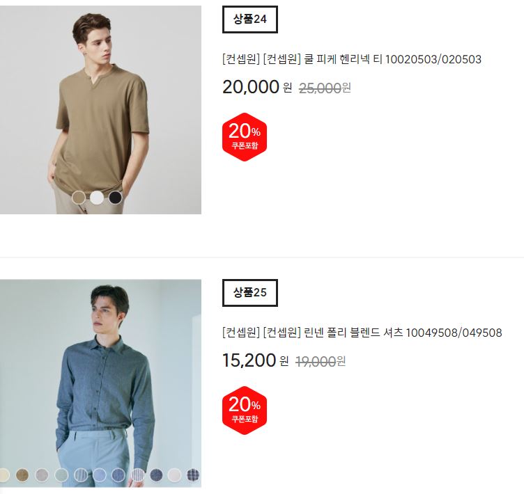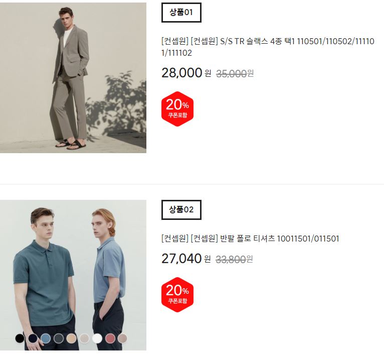 할인 품목 : 티셔츠, 팬츠, 셔츠 등