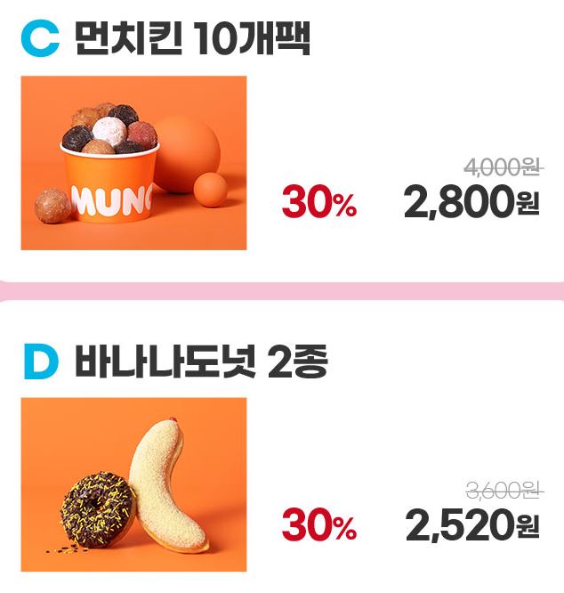 할인 메뉴 : 바나나도넛 2종, 도넛 팩 등
