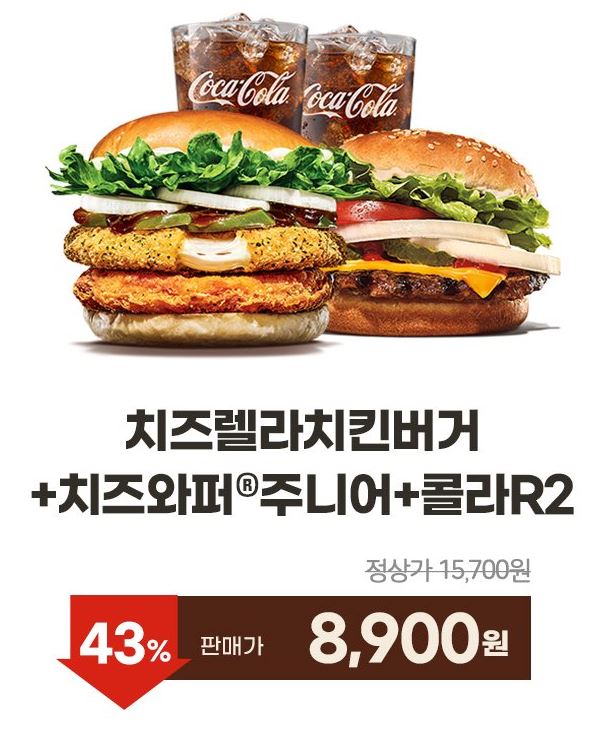 할인 메뉴 : 치즈렐라치킨버거+치즈와퍼주니어+콜라2잔 등