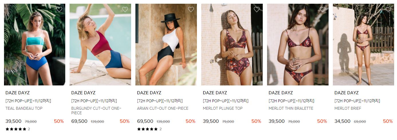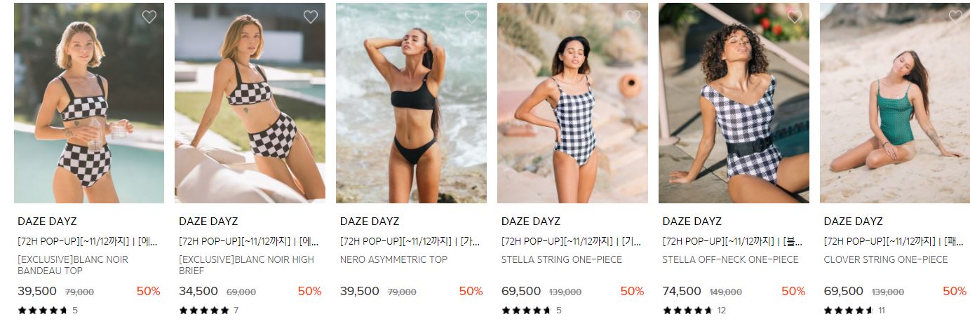 할인 품목 : 수영복, 원피스, 티셔츠 등