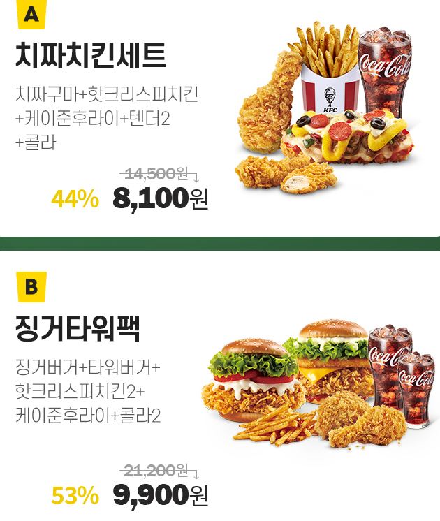할인 메뉴 : 치짜치킨세트, 징거타워팩 등