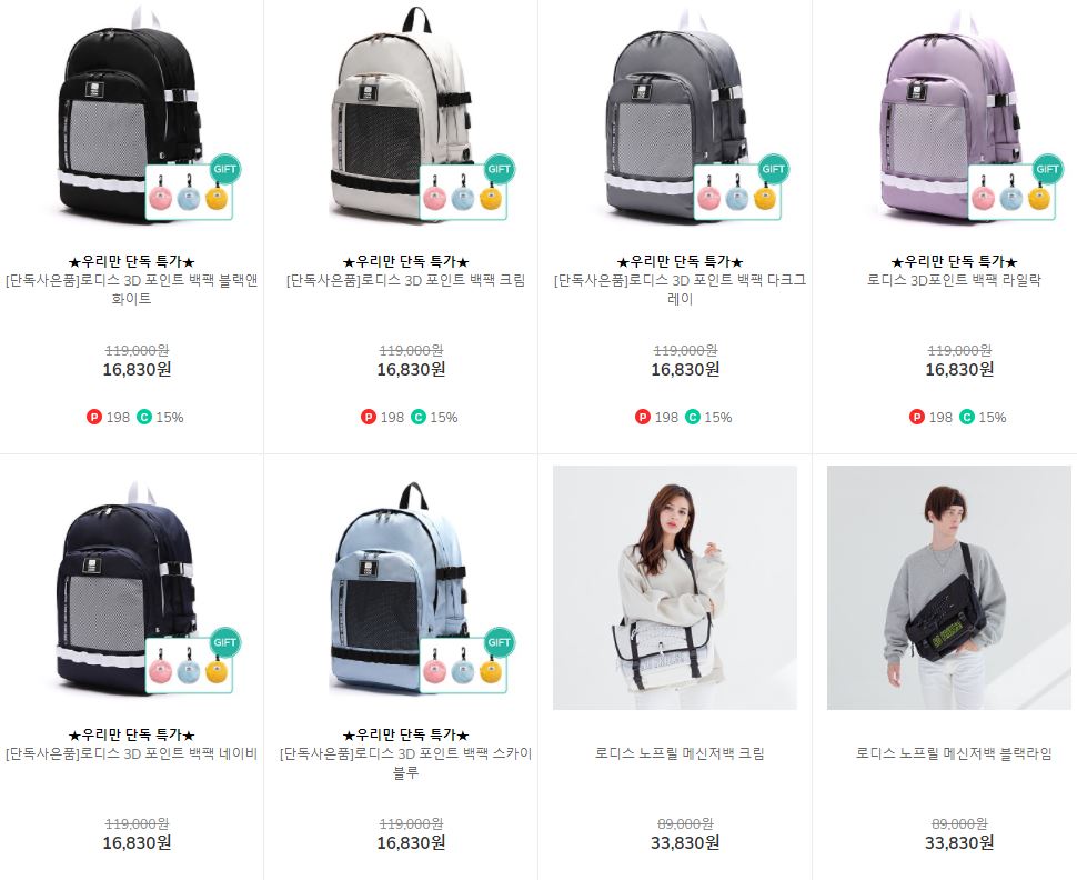 할인 품목 : 백팩, 메신저백 등