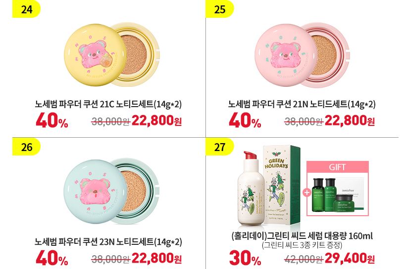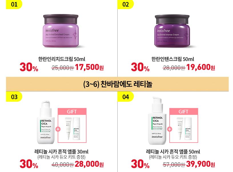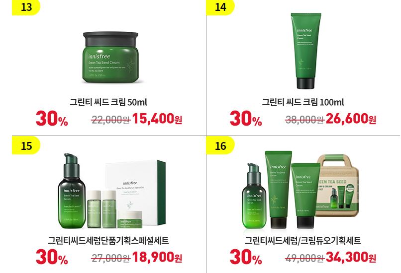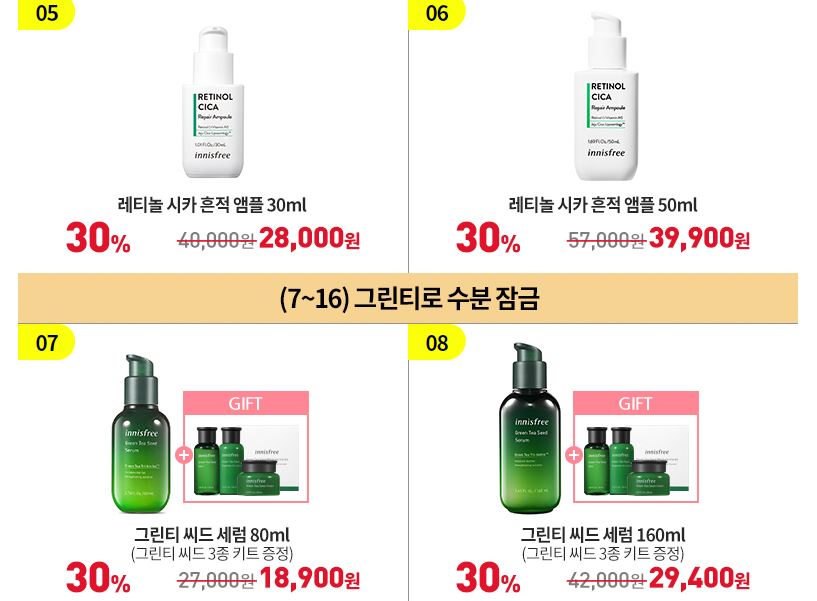 할인 품목 : 그린티 씨드 크림, 앰플 등