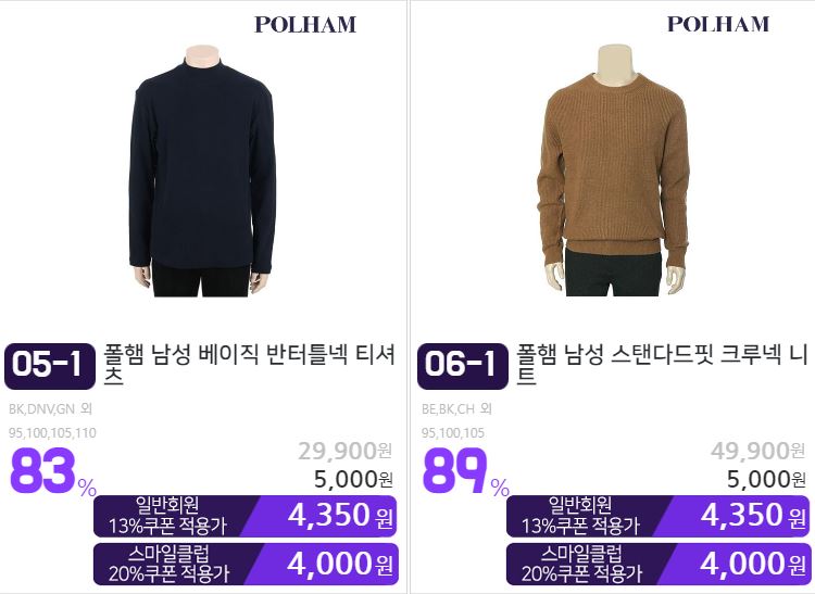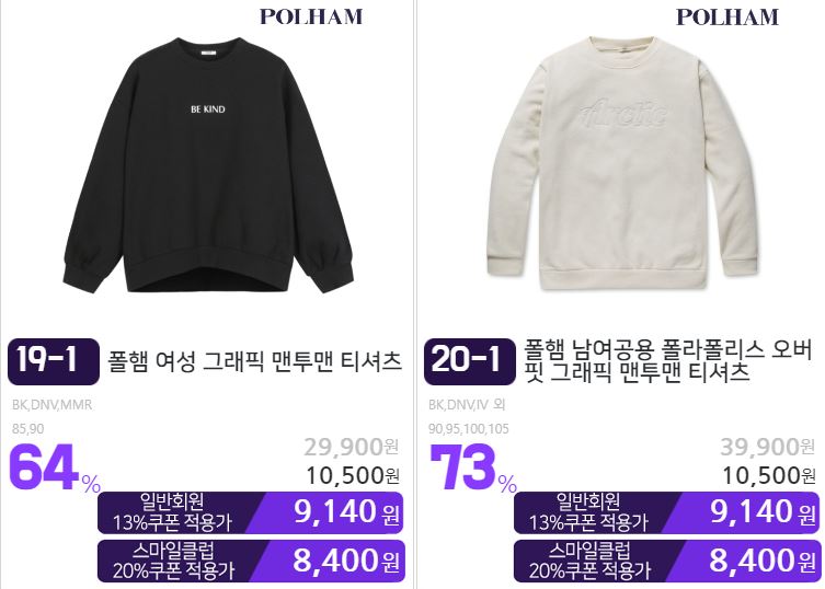 할인 품목 : 니트, 맨투맨, 팬츠 등