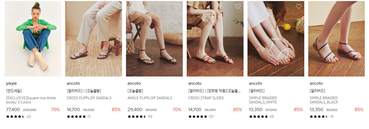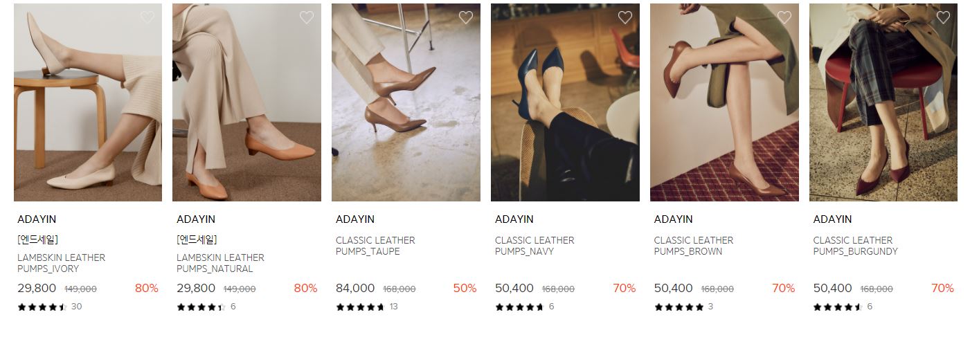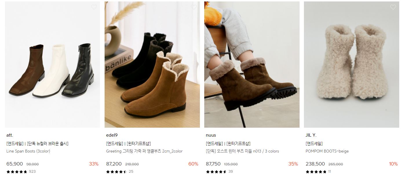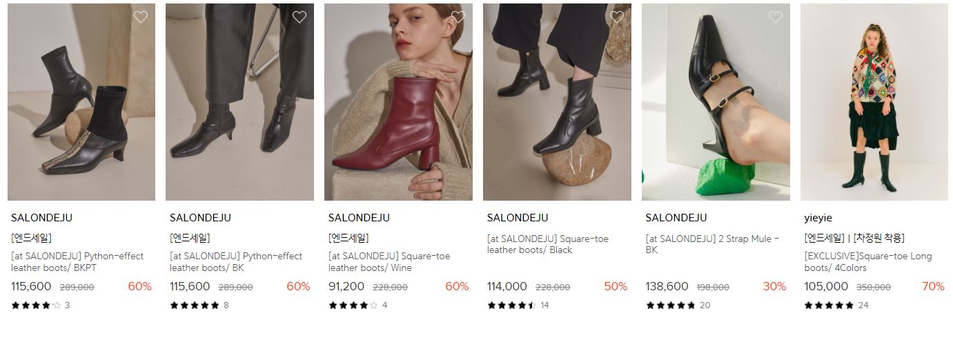 할인 품목 : 부츠, 펌픗, 플랫슈즈 등