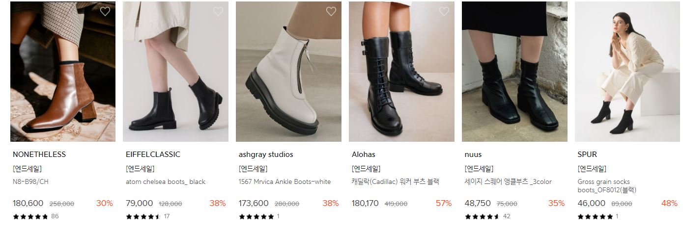 할인 품목 : 부츠, 펌픗, 플랫슈즈 등