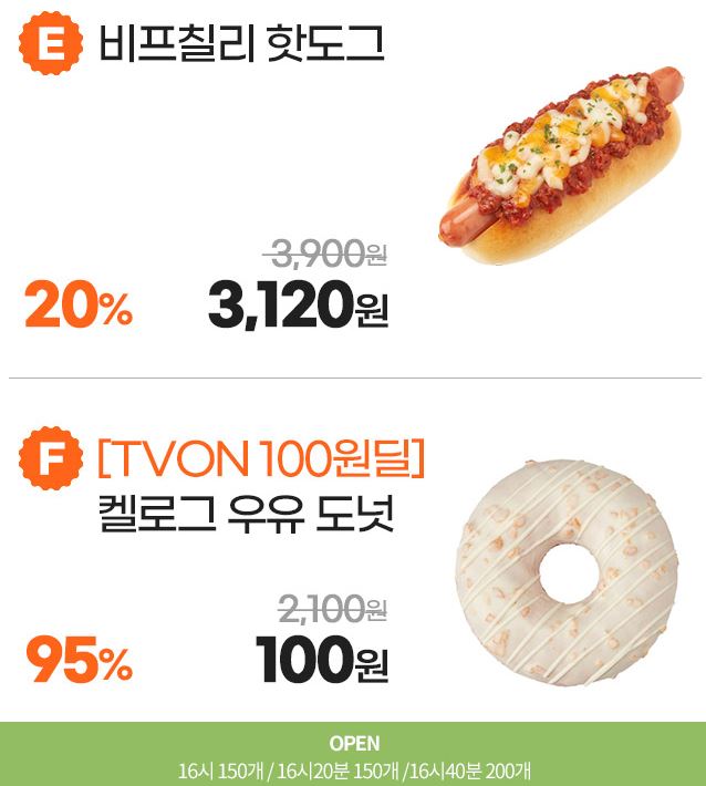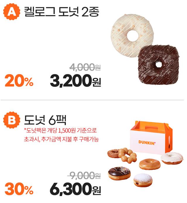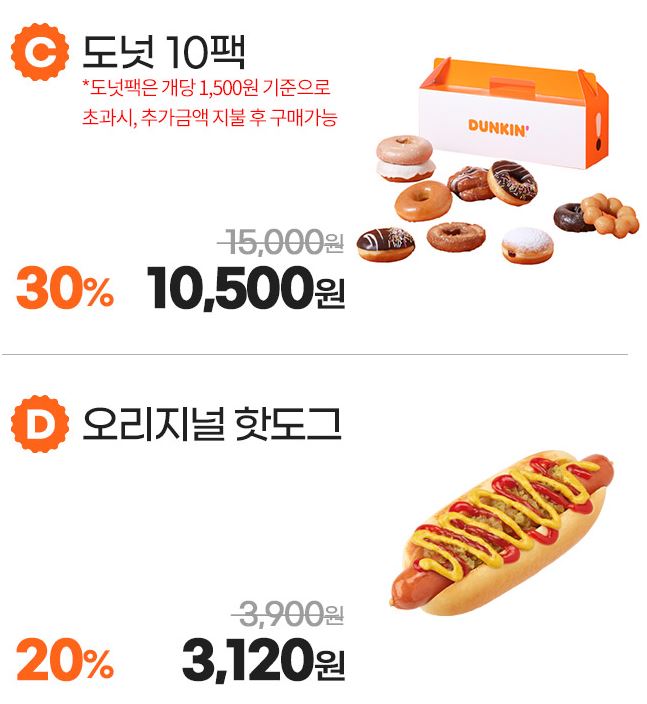 할인 메뉴 : 도넛 6팩, 오리지널 핫도그 등