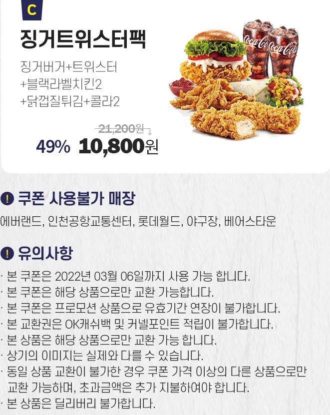할인 메뉴 : 순살치킨세트, 징거트위스터팩 등
