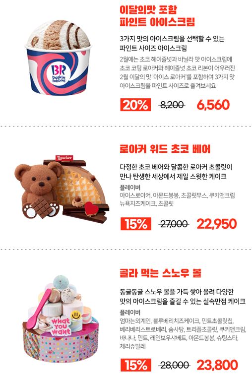 할인 메뉴 : 파인트 아이스크림, 로아커 위드 초코 베어 등
