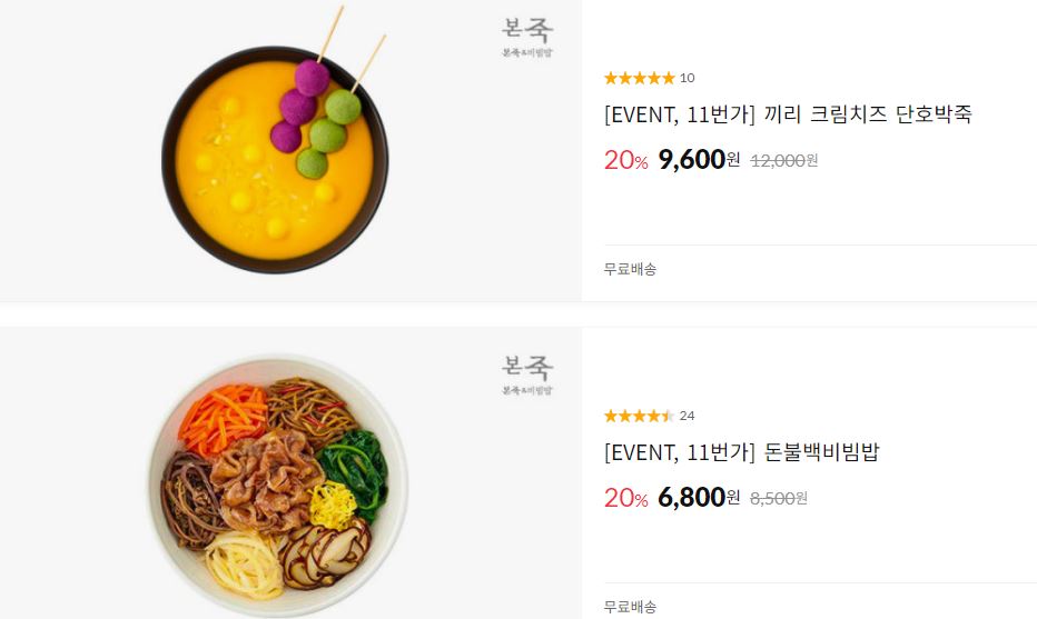 본죽 다양한 메뉴를 할인 판매하네요.