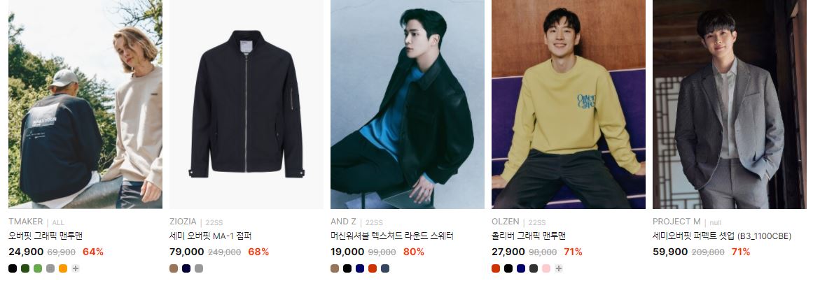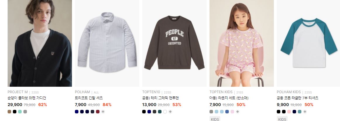 할인 품목 : 티셔츠, 팬츠, 셔츠 등