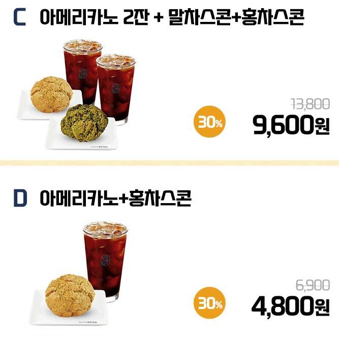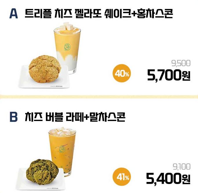 할인 메뉴 : 치즈버블라떼+말차스콘, 아메리카노+홍차스콘 등