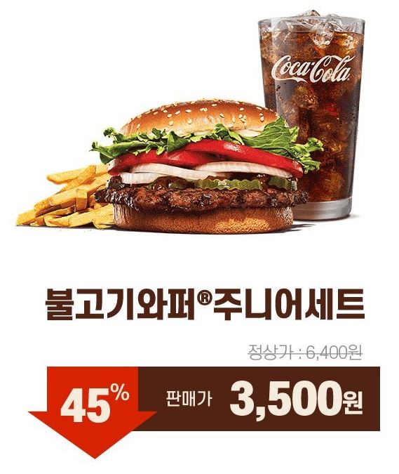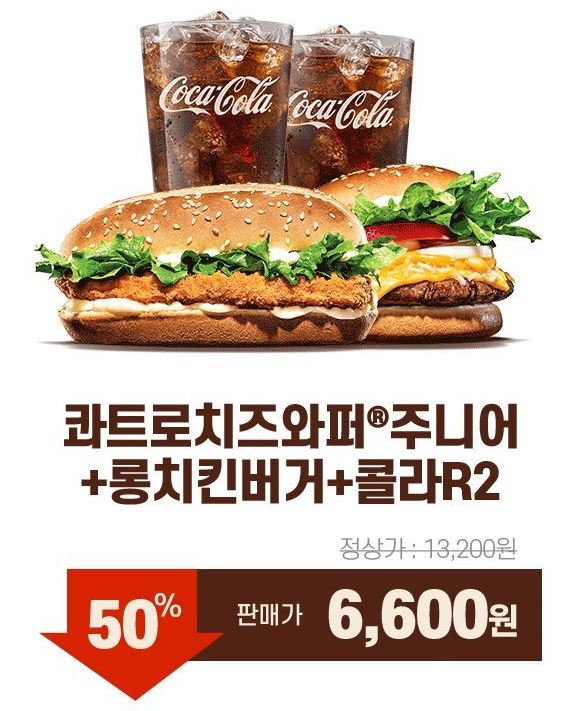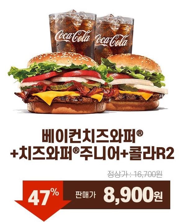 할인 메뉴 : 베이컨치즈와퍼+치즈와퍼주니어+콜라2잔 등