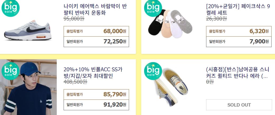 할인 품목 : 티셔츠, 운동화, 모자 등