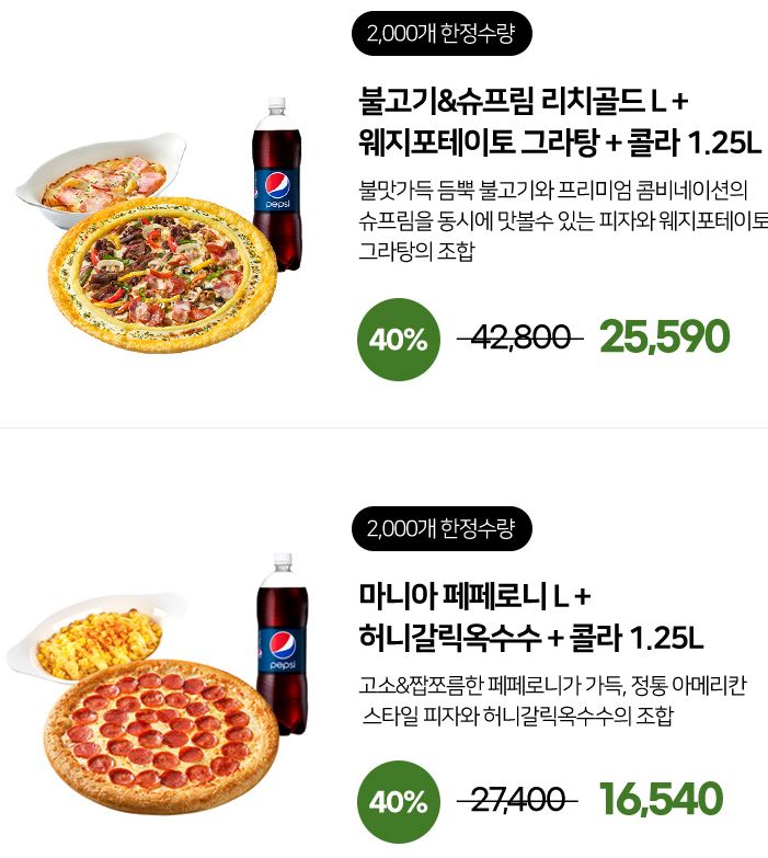 할인 메뉴 : 마니아페페로니L+허니갈릭옥수수+콜라 등