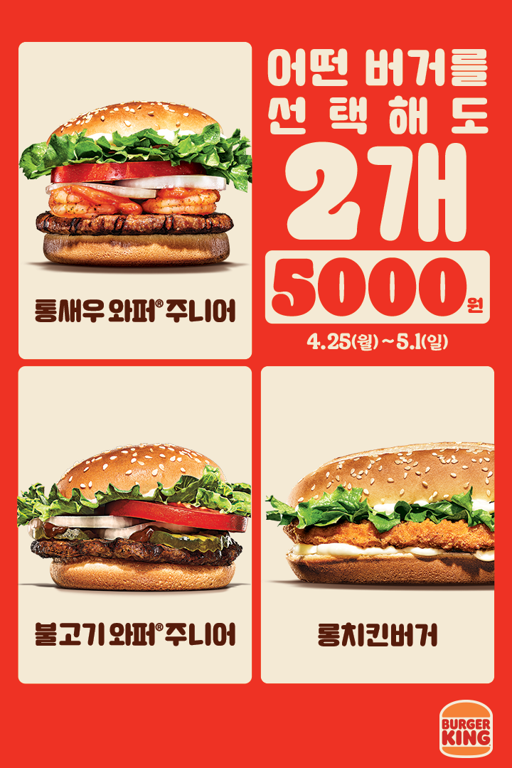 이벤트 버거 : 통새우와퍼주니어, 불고기와퍼주니어, 롱치킨버거