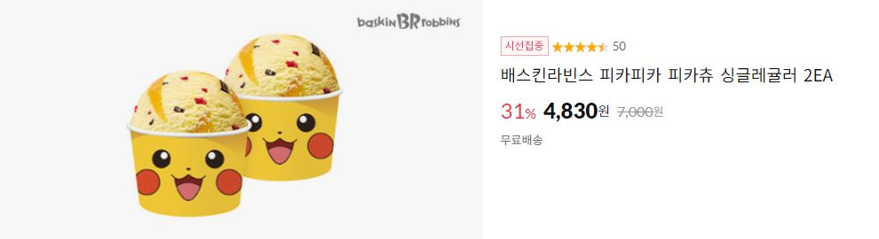 할인 메뉴 : 피카피카 피카츄 싱글레귤러, 골라 먹는 스노우 볼 등