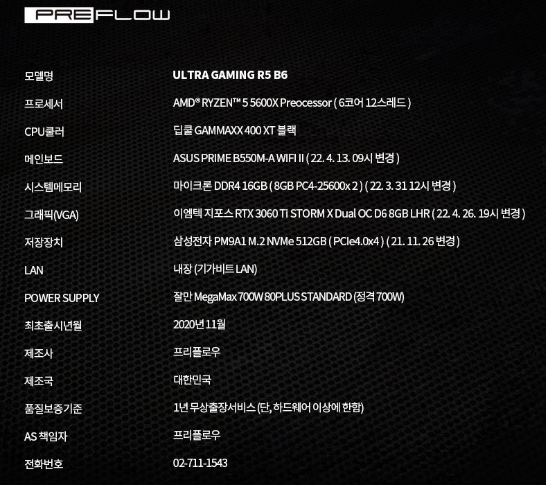 프리플로우 ULTRA GAMING R5 B6 5600X RTX3060TI 완본체 컴퓨터 할인 정보 [링크]