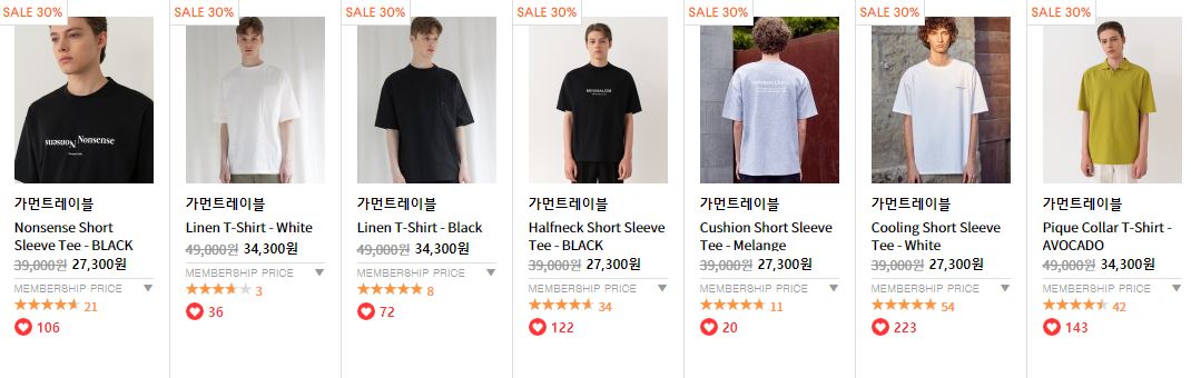 할인 품목 : 티셔츠, 팬츠, 가방 등
