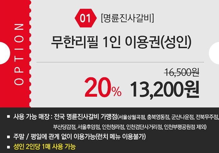 명륜진사갈비 무한리필 1인 이용권 20% 할인 정보 [링크]