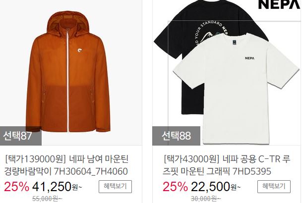 할인 품목 : 점퍼, 티셔츠, 팬츠 등